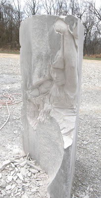 I am cutting the stone down to the outside of the hip, defining the waist and removing stone beneath the right arm.