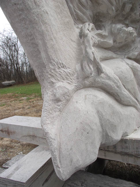 Daphne is nearly finished but I am going to turn her so that she is facing south (she is now facing west). This will help me to finish up her right side since it faces north,it is always in the shadows, never getting sunlight. By turning her to the south I will be able to see both left and right sides of the sculpture in the same light. Also, she is elevated on six timbers to aid in work around the bottom of the piece. This has made it difficult to work on areas on the upper areas of the sculpture, particularly the leaves. Moving the sculpture closer to the ground will make it easier to finish these areas.