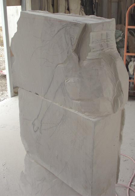 I decided to fold her right leg under her and have removed stone to indicate the leg, leaving it roughly cut to indicate fabric. I have cut the profile of the face and have removed some stone from behind the head.